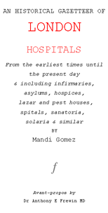 An Historical Gazetteer of London Hospitals contains within a single volume the historical record of hospital buildings in London. The Victorians did not mince their words and London can be mapped out during the period by body-parts: the Alexandra Hospital for Children with Hip Disease, City of London Hospital for Diseases of the Chest, St Andrew´s Eye and Ear Hospital and the Gordon Hospital for Fistula, Piles and other Diseases of the Rectum.